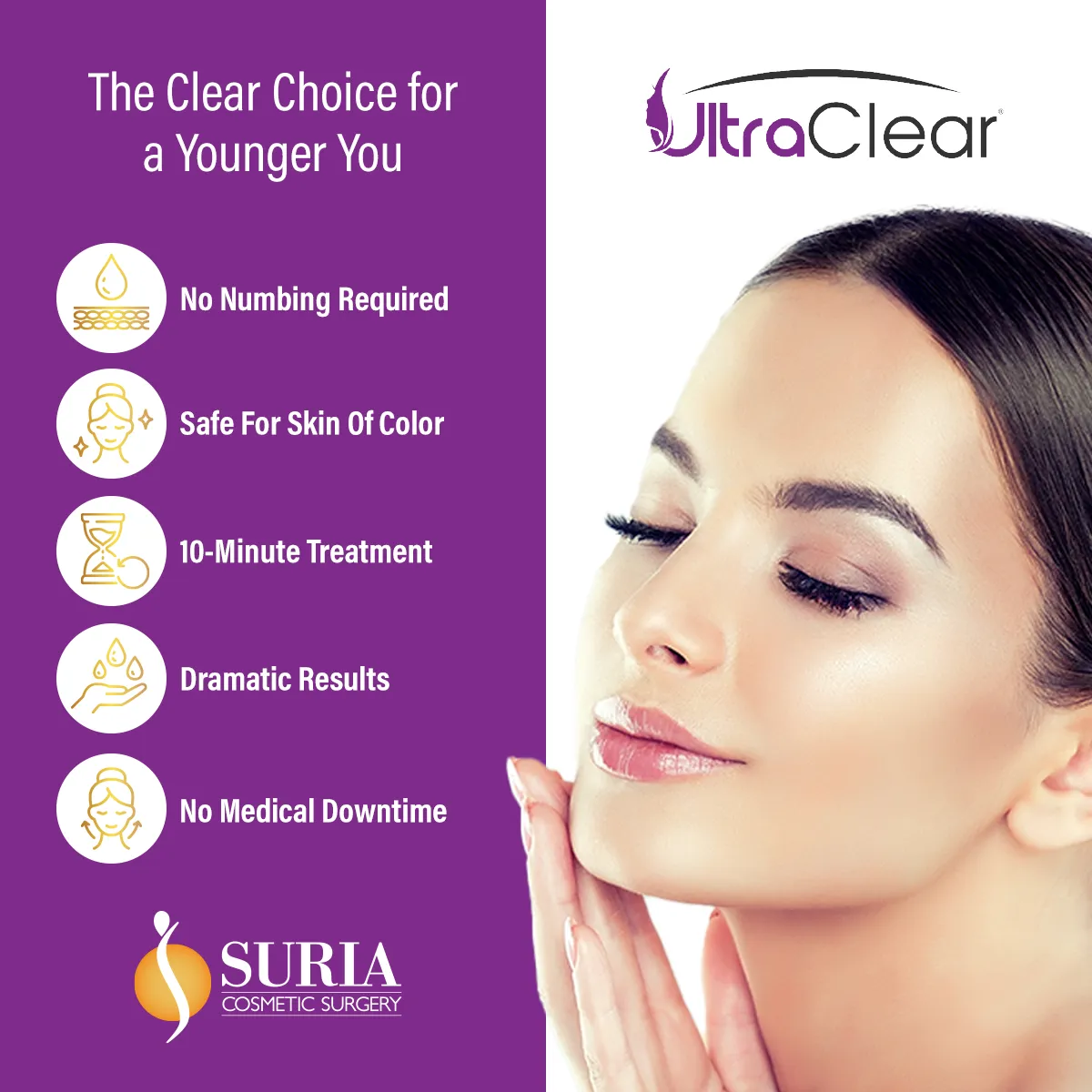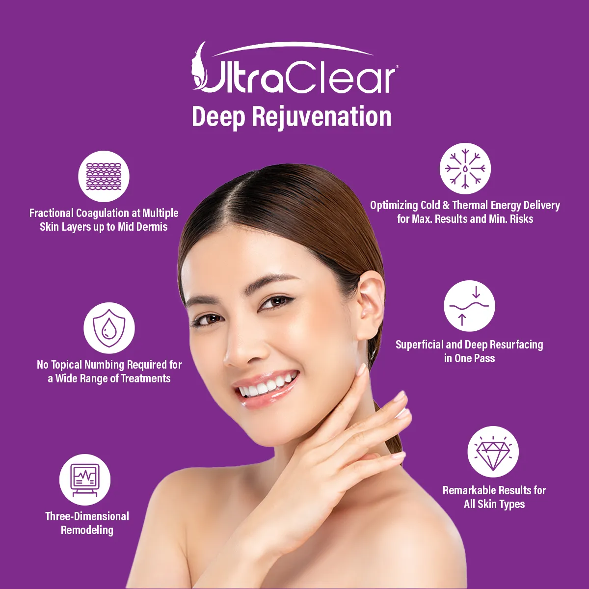 UltraClear™ is the World’s First Ablative Fiber Laser used to reverse signs of aging offering quick, little-to-no downtime treatments. FDA cleared for all skin types, and patients report smoother, more glowing skin in as little as one treatment.